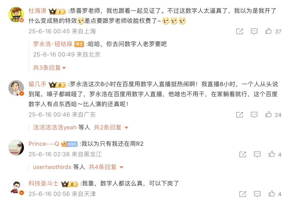 “数字分罗”出色的直播效果,让此前有些不放心的罗永浩本人都吓了一跳。直播结束后,罗永浩发微博感慨,“我和萧木的两个数字人在那儿眉来眼去,讲着跟我一样风格的段子,有点恍惚……但这就是现实。”老罗的粉丝们也不例外,纷纷留言表示“数字人太逼真了”、“比人演的还真”。