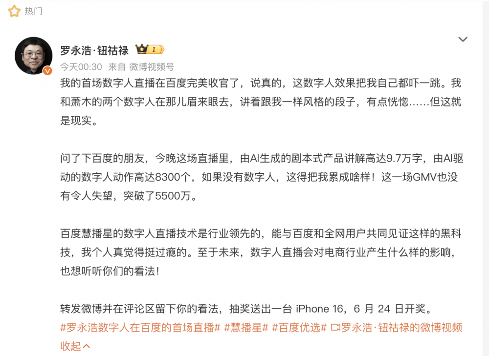 “百度慧播星的数字人直播技术行业领先。”罗永浩在本场直播后也认为。
