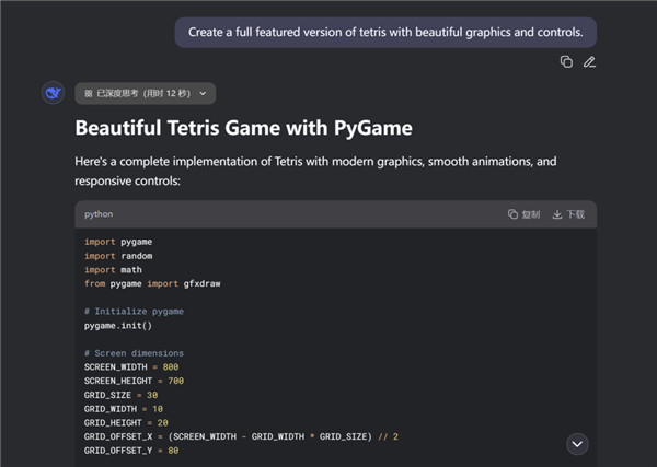 可以看到,DeepSeek-R1-0528思考12秒后就给出了一段python代码。