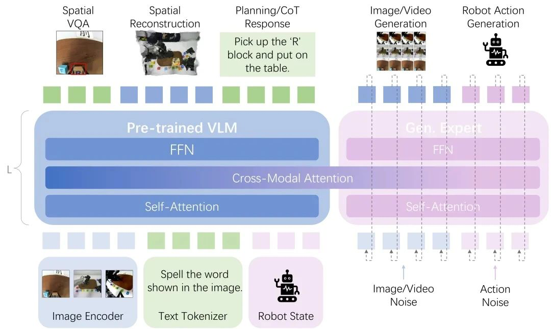 这种架构实现了具身多模态推理的涌现。当面对新任务时,系统能够像人类一样进行整体性认知处理——视觉理解、语义推理、物理预测和动作规划在统一空间内并行发生、相互影响,而非串行处理。