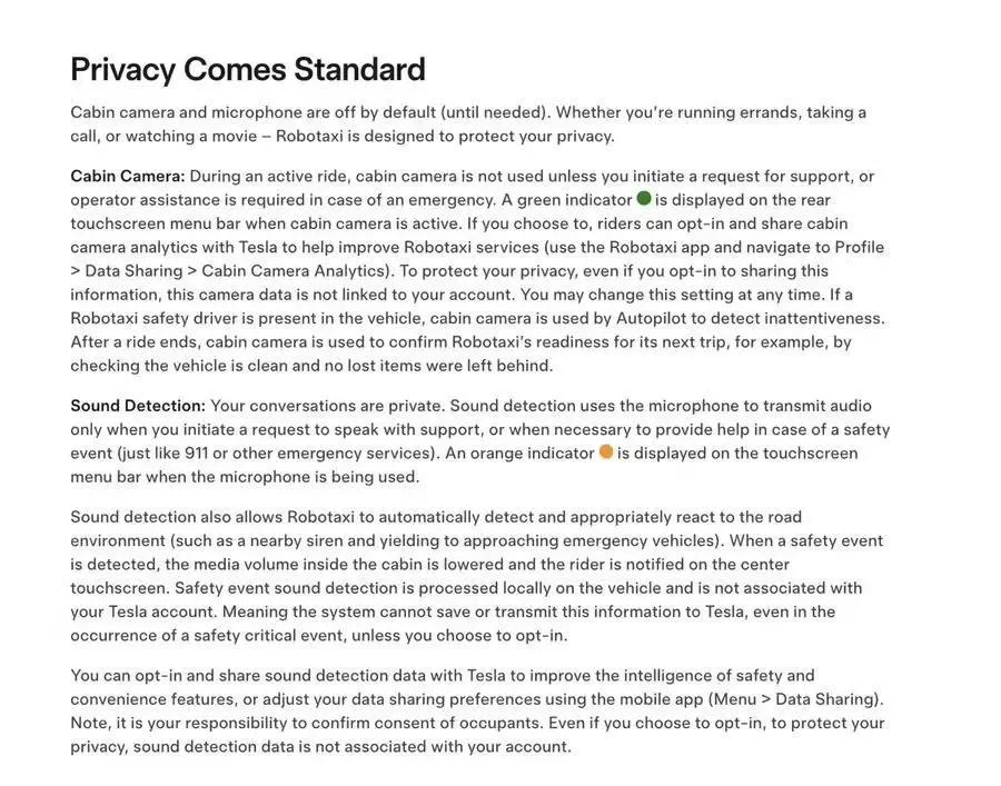 此外,特斯拉还承诺在恶劣天气下暂停服务,并保证车内摄像头仅在乘客求助时开启。车内麦克风则会持续运行,以便检测紧急车辆的警笛声,在用户需要联系平台客服或拨打 911 情况之外,不会将声音传输至特斯拉服务器。