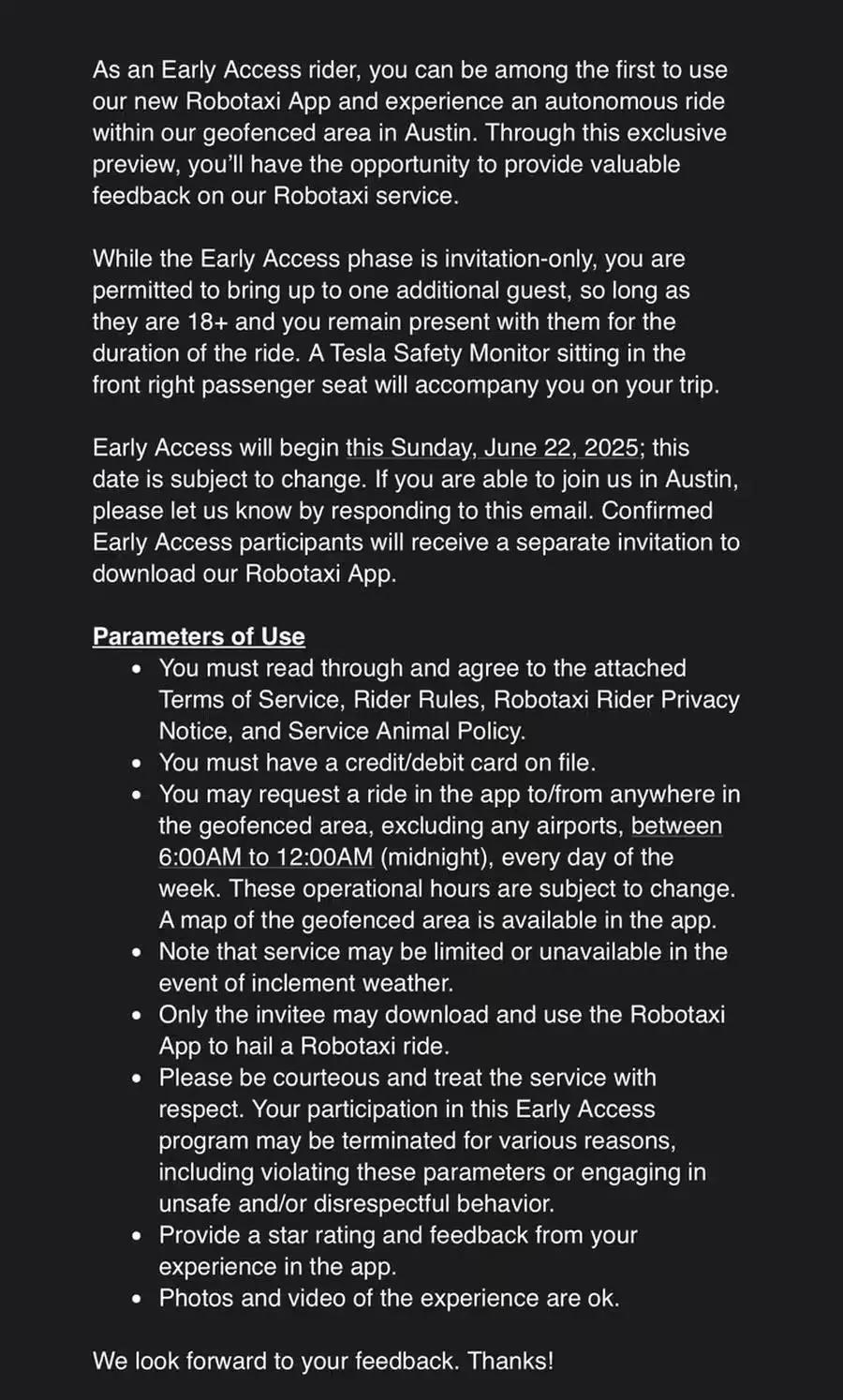 IT之家援引博文介绍,根据邀请函和部分公布的条款,早期测试阶段仅限受邀用户参与,测试车辆为无人驾驶的 Model Y,运行时间为每天 6 点至午夜,且仅限于特定地理围栏区域。