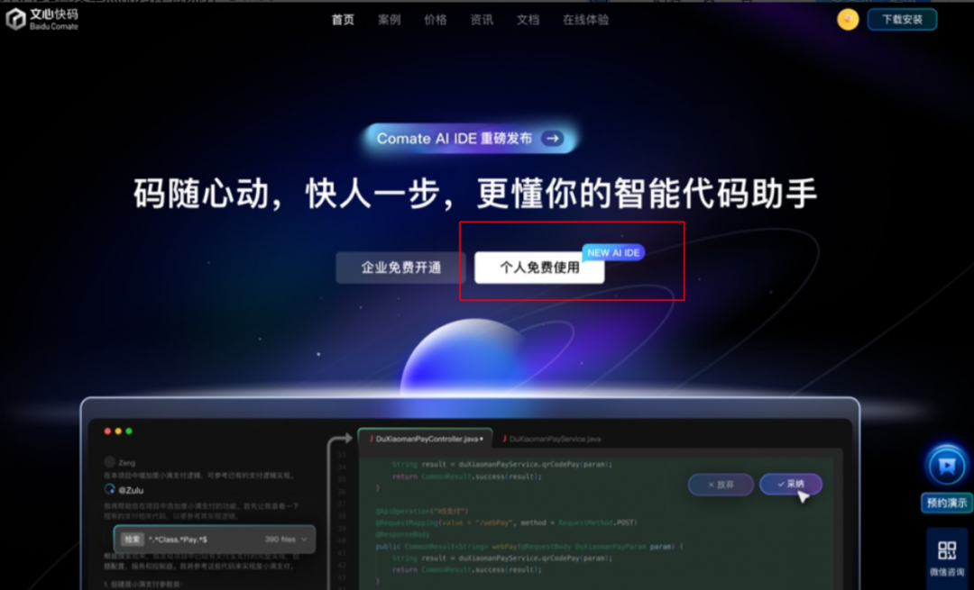 步骤一:进入Comate官网:https://comate.baidu.com/en,点击【个人免费使用】
