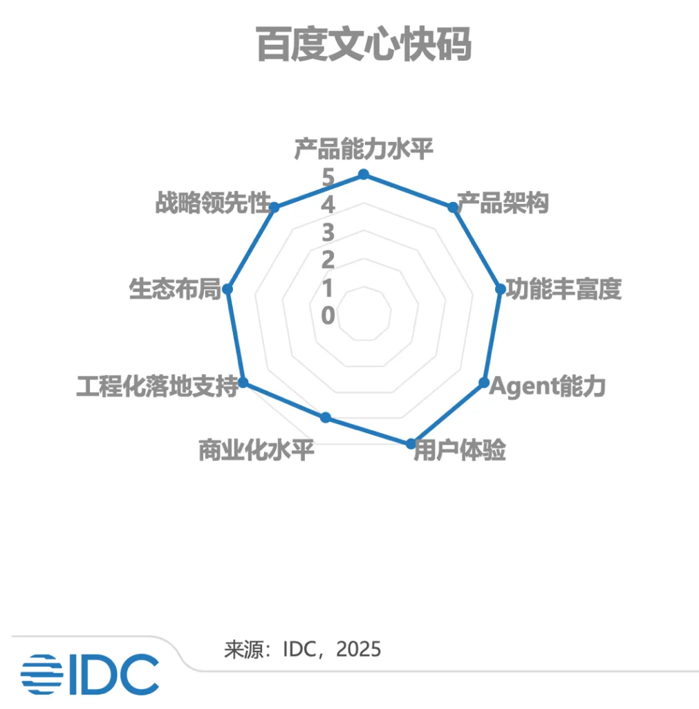 6月3日,IDC发布《IDC 中国市场代码生成产品评估,1H25》报告,显示,在综合评估的 9 项维度中,文心快码在产品能力水平、功能丰富度、产品架构、Agent能力、用户体验、工程化落地支持、生态布局、战略领先性共8个维度获得满分,满分维度数量第一。