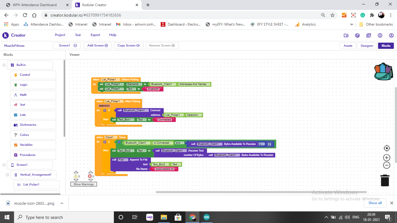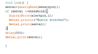 接下来,我们有循环功能,其中 EMG 传感器值与阈值保持检查并相应地更新(即,如果传感器值大于阈值,则会发出警报)。该值还会通过蓝牙发送到应用程序。