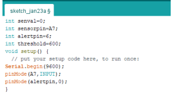获取组件后,安装 Arduino IDE,在其中进行编码。在这里,我们需要一个变量来存储传感器值。此外,定义引脚号以读取 EMG 传感器值。接下来,创建一个变量来存储阈值,该值将通知人们他们的肌肉拉伤水平。