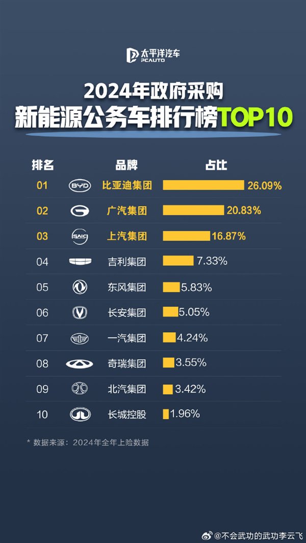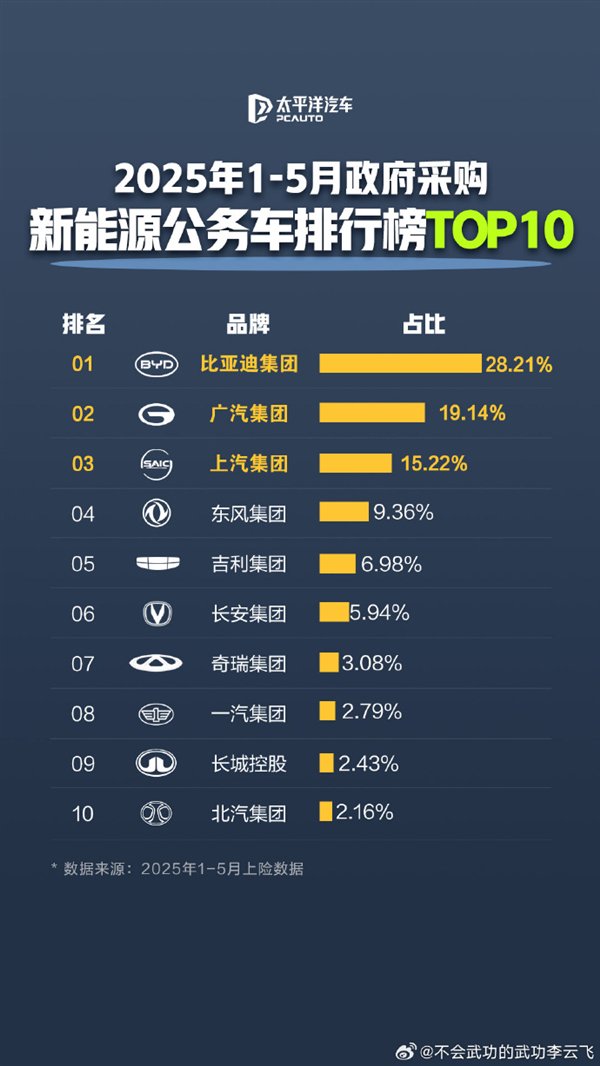 对此,比亚迪集团品牌及公关处总经理李云飞表示,比亚迪长期稳居榜首,成为新能源公务车政府采购首选。还配了一个#公务员都在开比亚迪#的话题。