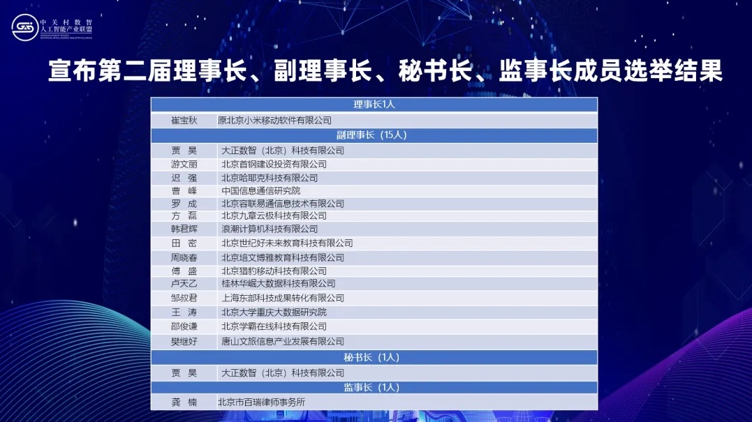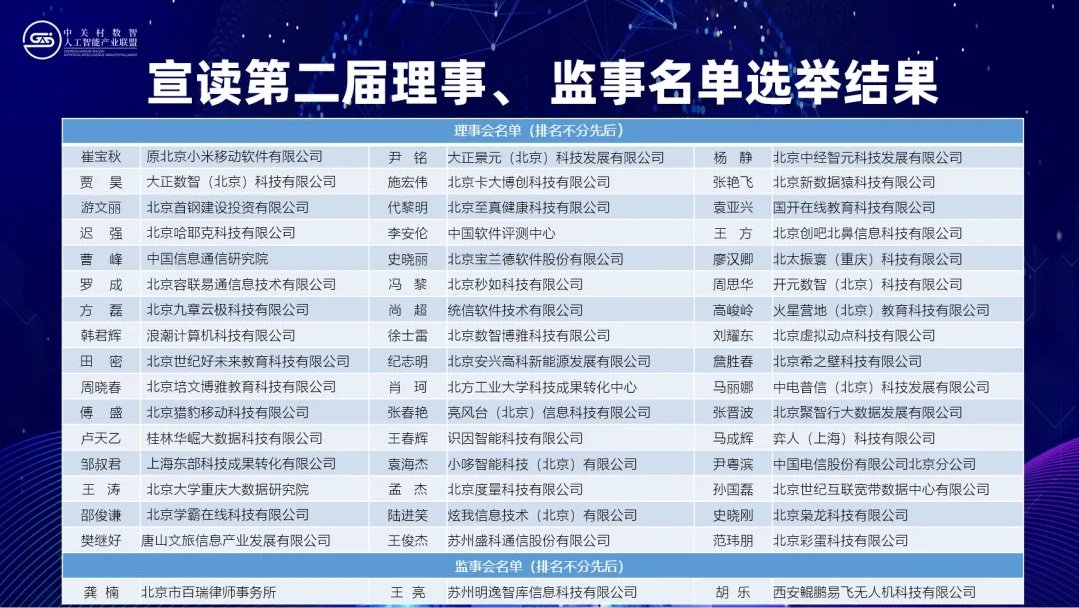 表决通过中关村数智人工智能产业联盟换届大会暨第二届第一次会员大会总监票人、监票人、计票人名单。以不记名方式选举联盟第二届理事长1名、副理事长15名、秘书长1名、监事长1名。在会员大会期间,审议选举出48名理事成员,3名监事成员,为联盟后续工作的规范有序开展提供了坚实的组织保障。