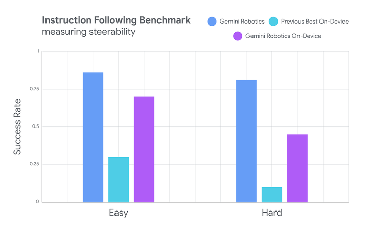 在更具挑战性的分布式任务或复杂的多步骤指令执行中,Gemini Robotics On-Device 的表现依然优于目前其他本地运行的替代方案。