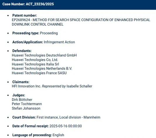 值得注意的是,2025年3月,华为也已经向UPC起诉联发科及联发科德国公司侵犯多项专利:涉及欧洲专利EP3905840(灵活新无线电长期演进共存的信号指示)的ACT_13761/2025案;涉及欧洲专利EP4142215(一种获取UE安全能力的方法和装置)的ACT_14180/2025案。