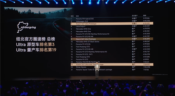 因此,在今年,小米SU7原型车再次挑战纽北赛道,以6:22.031的成绩再次刷新记录,并且在纽北赛道总榜上取得了第三名的好成绩。