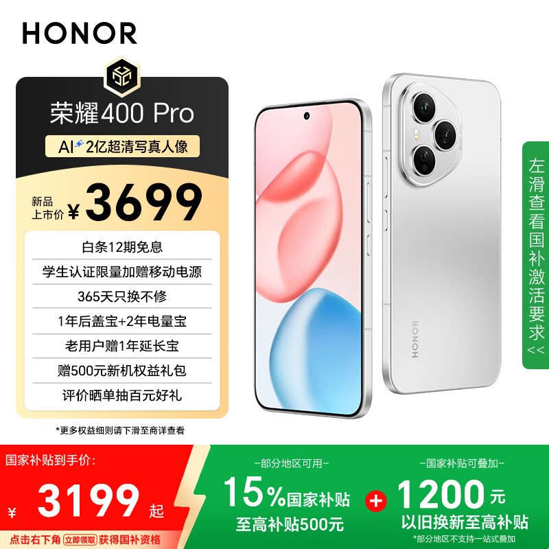 荣耀HONOR 400 Pro揽月银 性能强劲12GB+512GB限时特惠价3199元