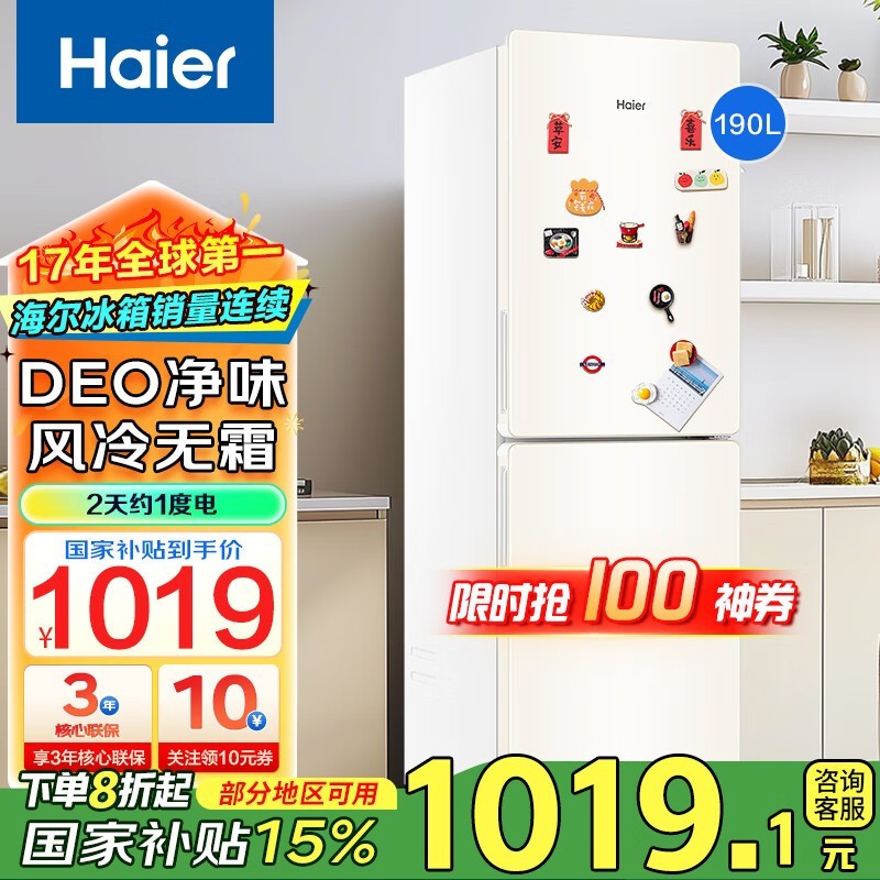 海尔190升双开门冰箱限时特惠1019元