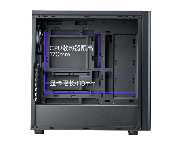 存储扩展方面,该机箱提供2个3.5英寸硬盘位和2个2.5英寸硬盘位(可扩展至最多6个),采用便捷的可拆卸硬盘盒设计。同时配备7个PCI扩展槽,支持170mm高的CPU散热器和最长410mm的显卡(安装前置散热器时为360mm)。