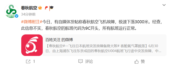 此事引起热议后,春秋航空官方发文称,有自媒体发帖称春秋航空飞机故障,极速下落3000米。经查,此信息不实,春秋航空的航班代码为9C开头,所有航班运行正常。