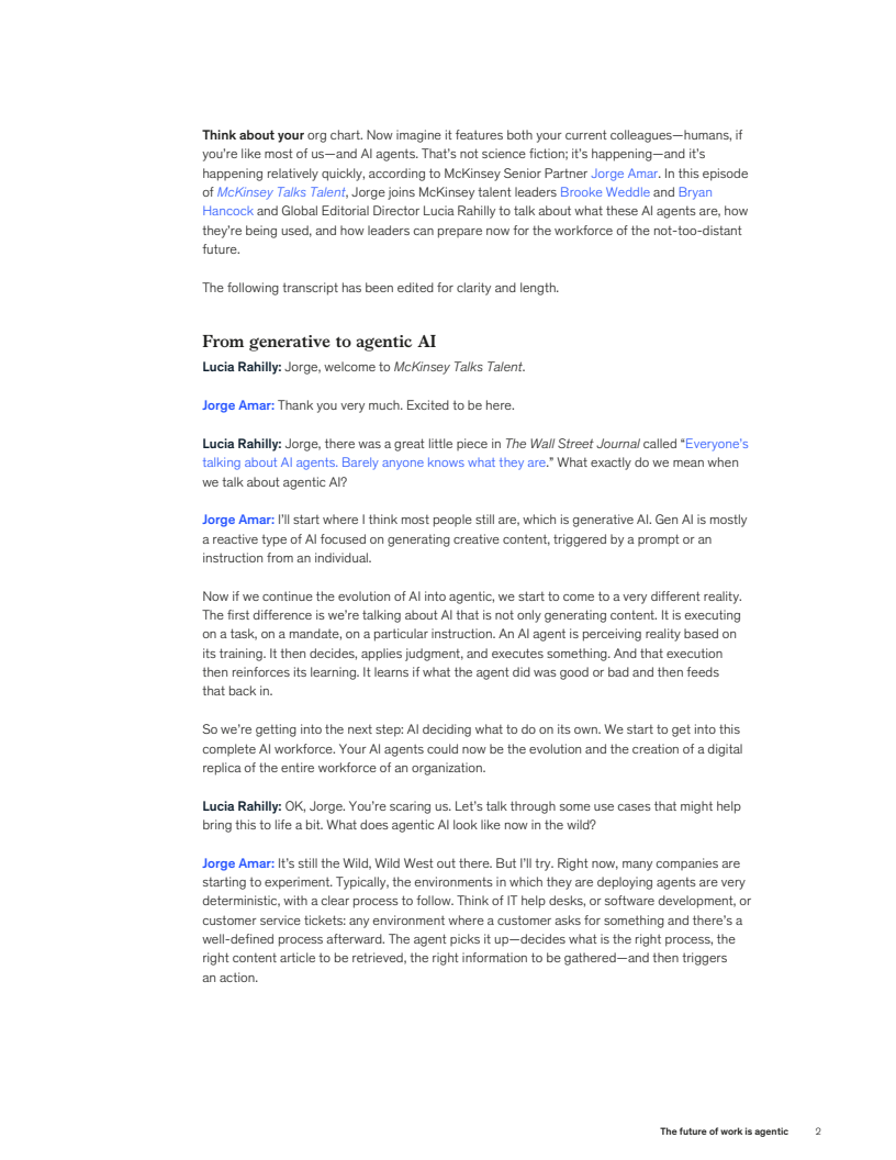 报告显示,代理型AI(agentic AI)正从生成式AI演进而来,具备自主决策与任务执行能力。与仅能生成内容的生成式AI不同,代理型AI通过动态学习闭环优化决策,其应用将重塑未来职场结构。