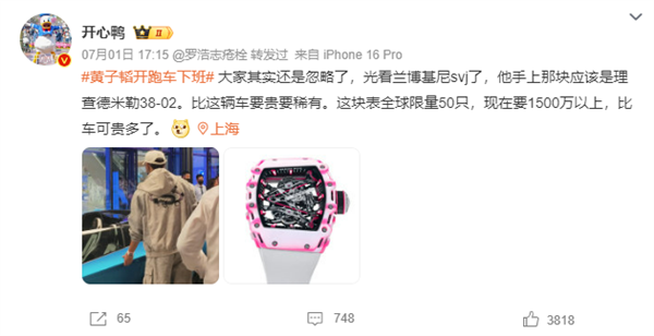BTW,有专业人士注意到黄子韬开车门时左手腕上戴着的一块腕表,其科普称,这是理查德米勒38-02,全球限量50只,现在要1500万以上,比兰博基尼Aventador SVJ敞篷版更稀有更贵。