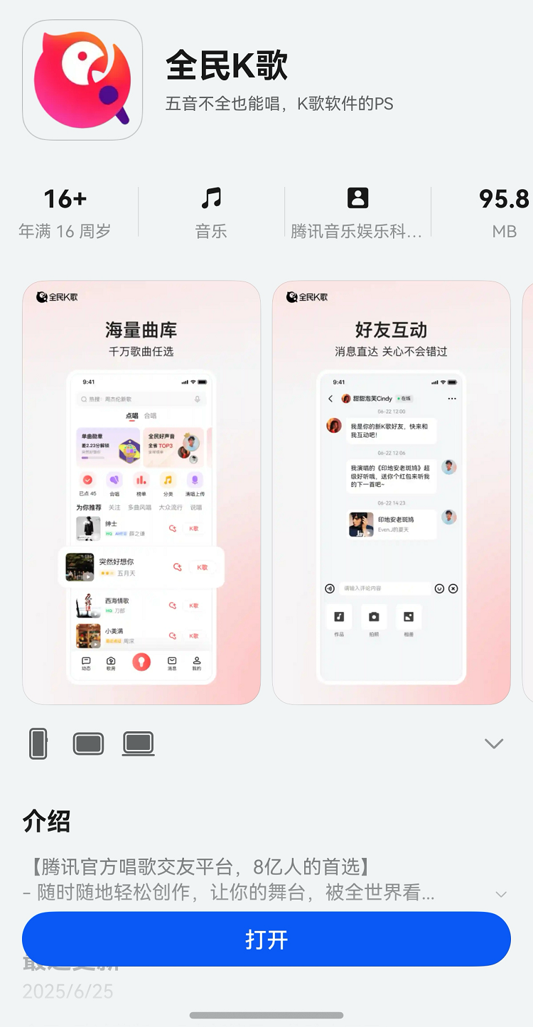 目前,鸿蒙版全民K歌已适配手机、平板和鸿蒙电脑等多种设备,让用户可以在多种设备上尽情K歌。此外,为便于用户反馈问题,鸿蒙版全民K歌开放了QQ体验群(群号:786085908)和反馈渠道,用户可以在QQ群中交流使用心得和产品建议,也可以在“我的-设置-帮助与反馈”中随时反馈体验问题。相信有了广大用户的积极共创,鸿蒙版全民K歌将快速迭代,给广大用户带来更沉浸、更有趣的K歌与社交体验。