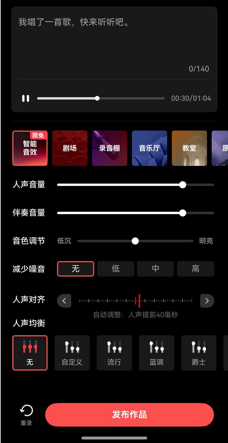 ·人声对齐:全民K歌可根据用户演唱情况自动进行人声伴奏对齐,用户也可手动拖拽调节。