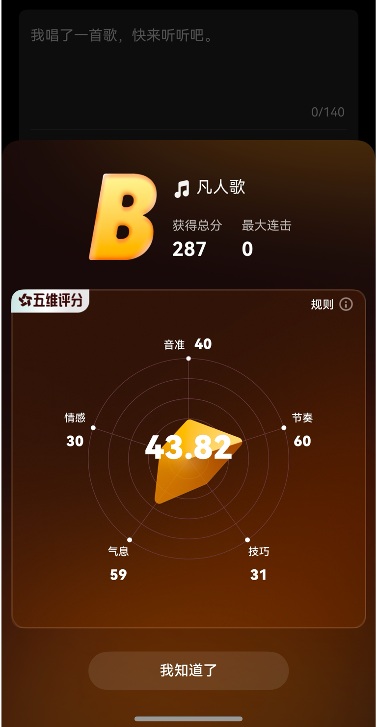 ·五维打分:演唱结束后,用户可以通过五维打分(音准、节奏、气息、情感、技巧)科学、全面地了解自己的演唱表现,从而进行有针对性的提升。