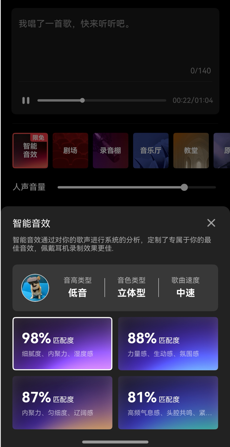 ·智能音效:新增“智能音效”,通过对用户的歌声进行系统分析定制专属的最佳音效,用户也可以在剧场、录音棚、音乐厅、教堂等多种音效之间切换;