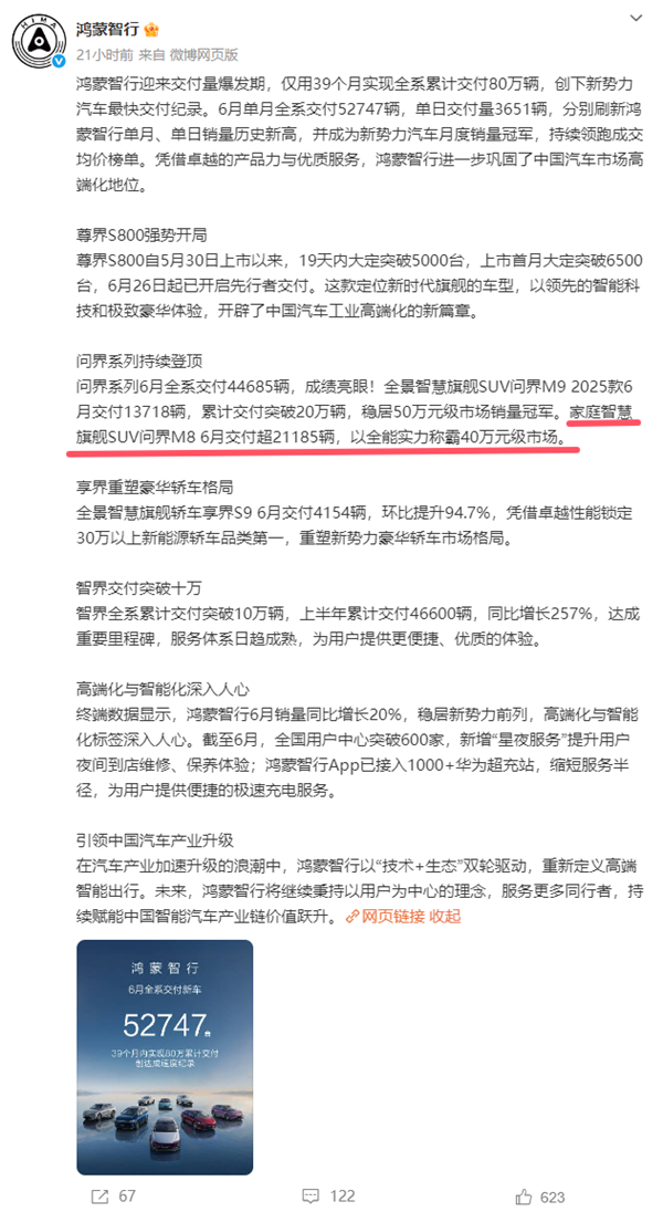 昨日鸿蒙智行官宣6月单月全系交付52747辆,其中问界系列交付44685辆,表现最为亮眼的当属M8,交付21185辆成为了40万元市场的第一名!