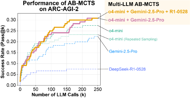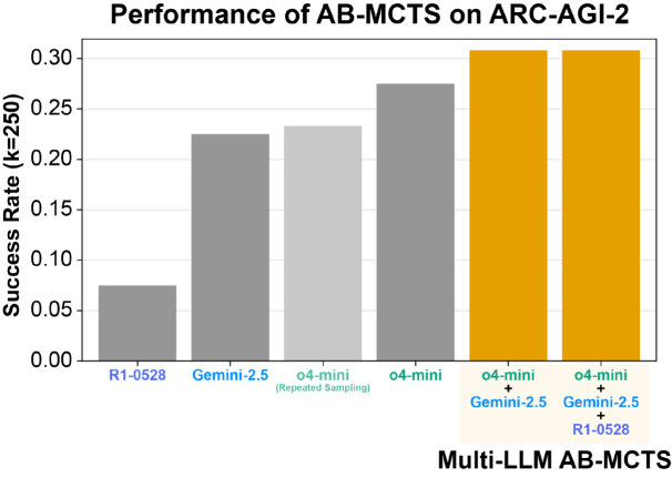 AB-MCTS 则能通过利用这些特性,使多个模型能够协同工作并能进行有效试错,从而解决了单一 AI 系统难以应对的复杂问题。在 ARC-AGI-2 基准测试上,AB-MCTS 将 o4-mini、Gemini-2.5-Pro 和 DeepSeek-R1-0528 等前沿 AI 模型加以结合,借此打造出一个名为 Multi-LLM AB-MCTS 的系统,并发现该系统的性能大幅超越了单个模型的性能。