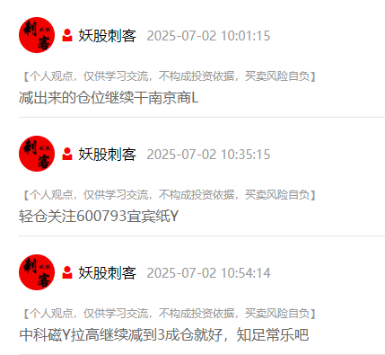 今日小圈子策略:昨天重仓的中科磁业今天最高大涨7%,分批落袋为安,减出来的仓位埋伏了南京商旅、宜宾纸业全都涨停,逆势吃大肉,今天基本是点谁谁涨停。