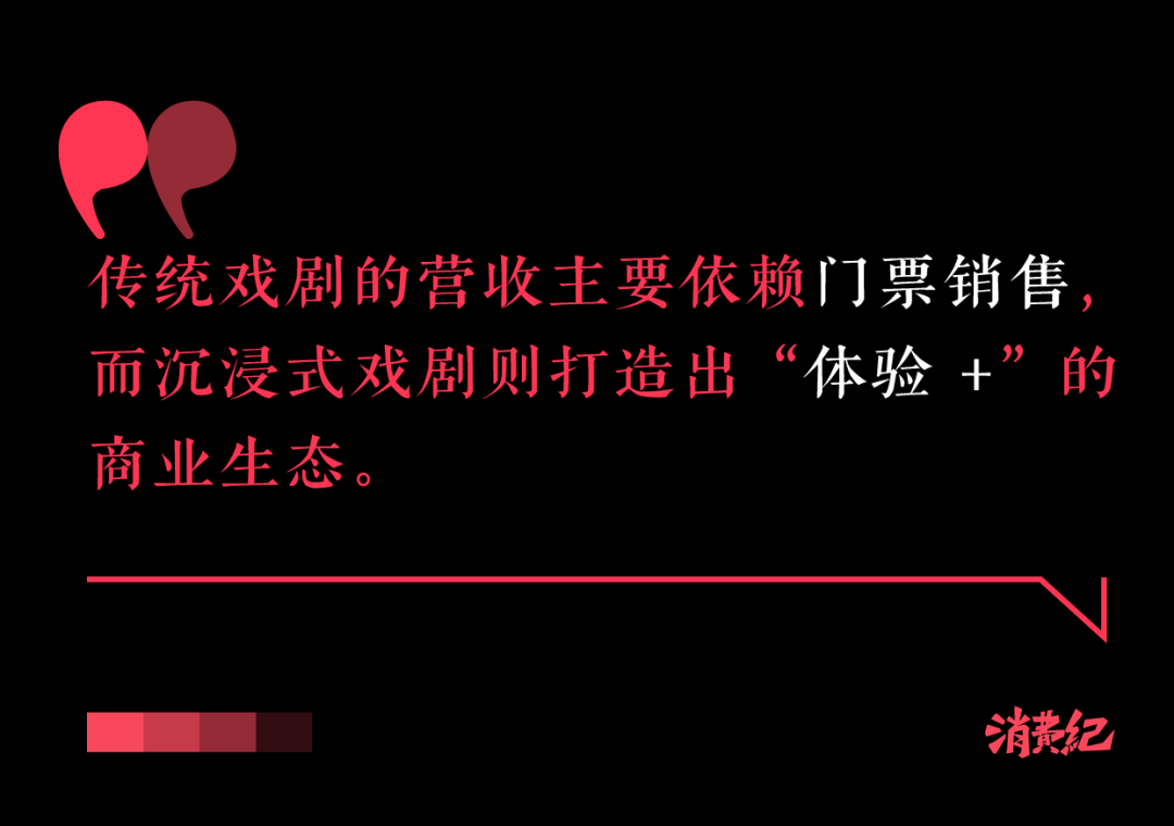 沉浸式戏剧在这一点也已经做了不少探索。传统戏剧的营收主要依赖门票销售,而沉浸式戏剧则打造出“体验 +”的商业生态。