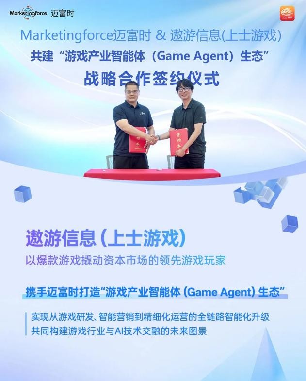 Marketingforce迈富时与国内顶尖游戏企业遨游信息(上士游戏)达成重要战略合作。此次合作,旨在融合双方在AI技术与游戏领域的深厚积淀,共同打造创新性的“游戏产业智能体(Game Agent)生态”。