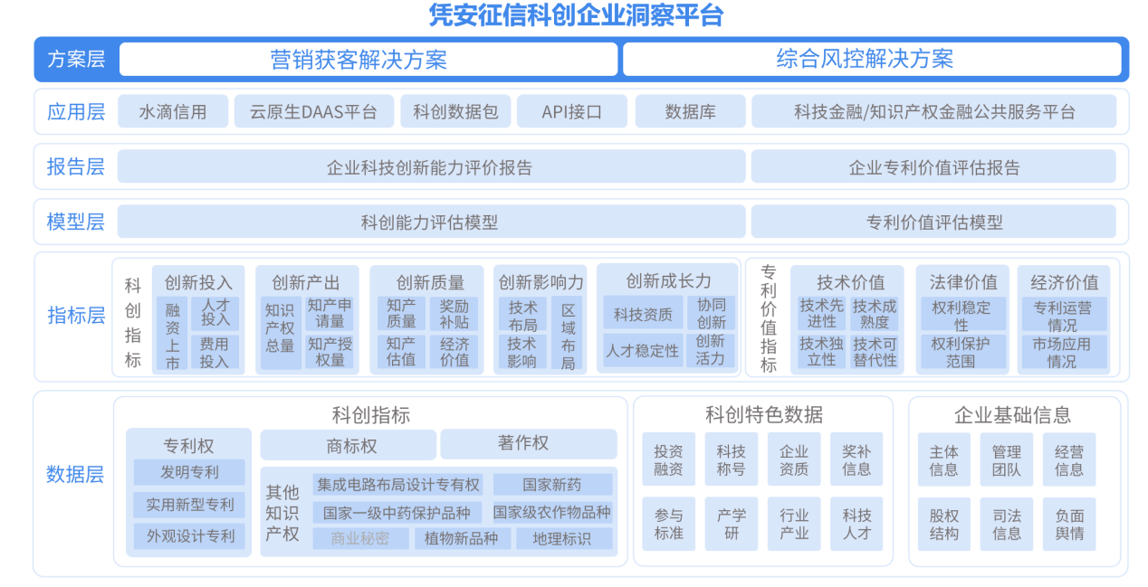 水滴信用凭借覆盖全国企业全量、多维、动态的海量数据资产,打造的科创企业洞察平台构建了从企业底层数据到商业顶层应用的完整科学体系,让科创企业的技术价值真正成为可识别、可量化、可流通的价值物。水滴信用科创企业洞察平台体系架构机构分数据层、指标层、模型层、报告层等六个层级,各层级既可单独提供服务,又层层支撑。
