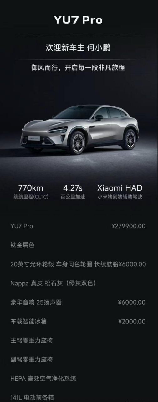 另外,除了小米YU7上市首发权益免费赠送的主副驾零重力座椅、HEPA高效空气净化系统、141L电动前备箱以外,何小鹏还选了6K元的25扬声器和2K元的车载智能冰箱,想必下单小米YU7的用户,这两项属于“必选配置”了。