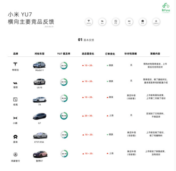 在横向主要竞品反馈上,Model Y是小米YU7的第一竞品,在小米新车发布后特斯拉订单微跌;第二竞品居然是主打增程动力形式的理想L6/i6,同样订单量微跌;然后是极氪7X,因为推出针对性的展车优惠政策和换定补偿,订单量反而在小米YU7上市后微涨;