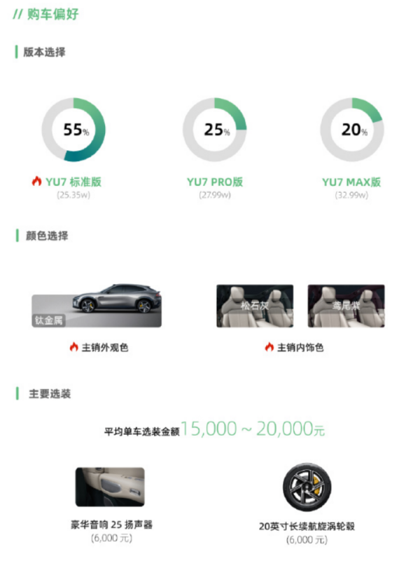 这一结论也得到了第三方@孙少军的统计支持。从他发布的「72小时新车上市一线快报」来看,客户主要集中在22-35岁等年轻用户群体,男性比例55%,其中55%比例用户选择25.35万元的YU7标准版;25%比例用户选择27.99万元的YU7 Pro版;剩下20%比例用户选择的YU7 Max版。