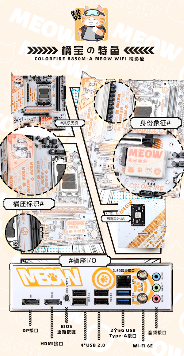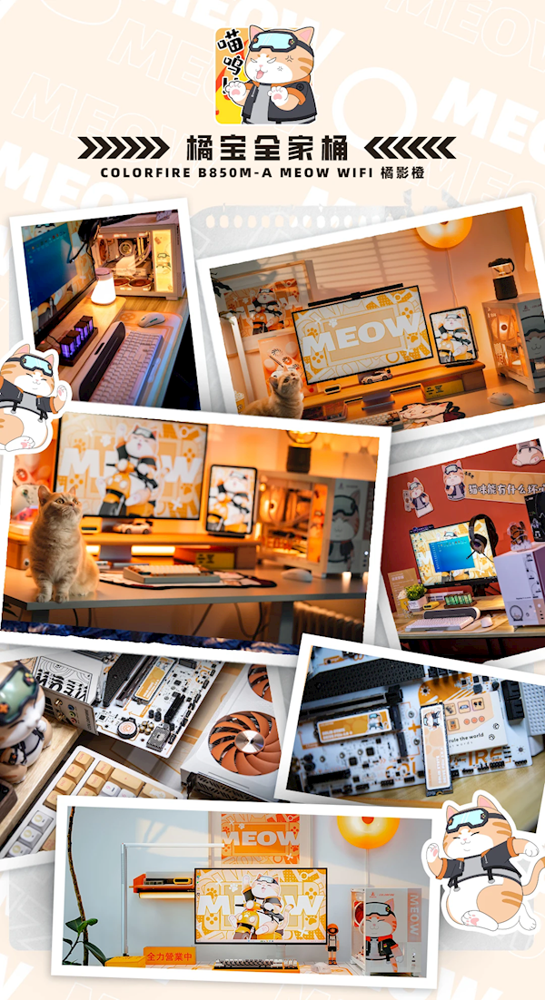 本次发布的COLORFIRE B850M橘影橙,依然以品牌IP“橘宝”形象作为设计灵感,活泼可爱的橘白配色,定制主题PCB充满了丰富的猫爪图案和萌宠系列元素。