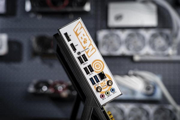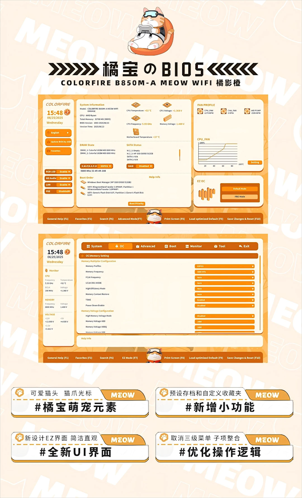 VRM供电电路的散热装甲不仅采用复合工艺打造,高效散热,还加入了橘宝专属铭板,甚至在锂电池上都特别设计了猫爪贴纸,让硬件不再冷冰冰,BIOS也采用了专属主题设计。