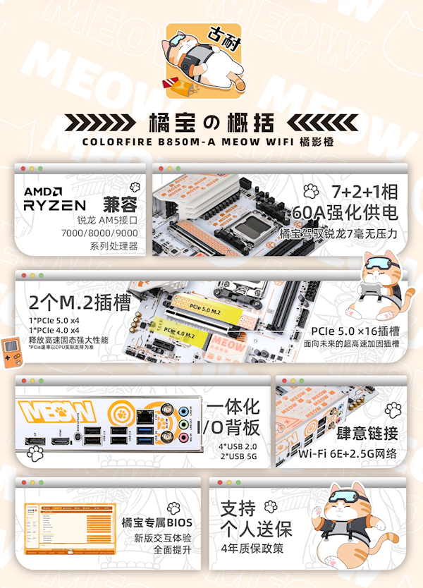这是COLORFIRE的首款AMD AM5平台主板,无疑也是最萌的,妥妥的喵趣横生,而价格定为899元,提供4年质保,支持个人送保。