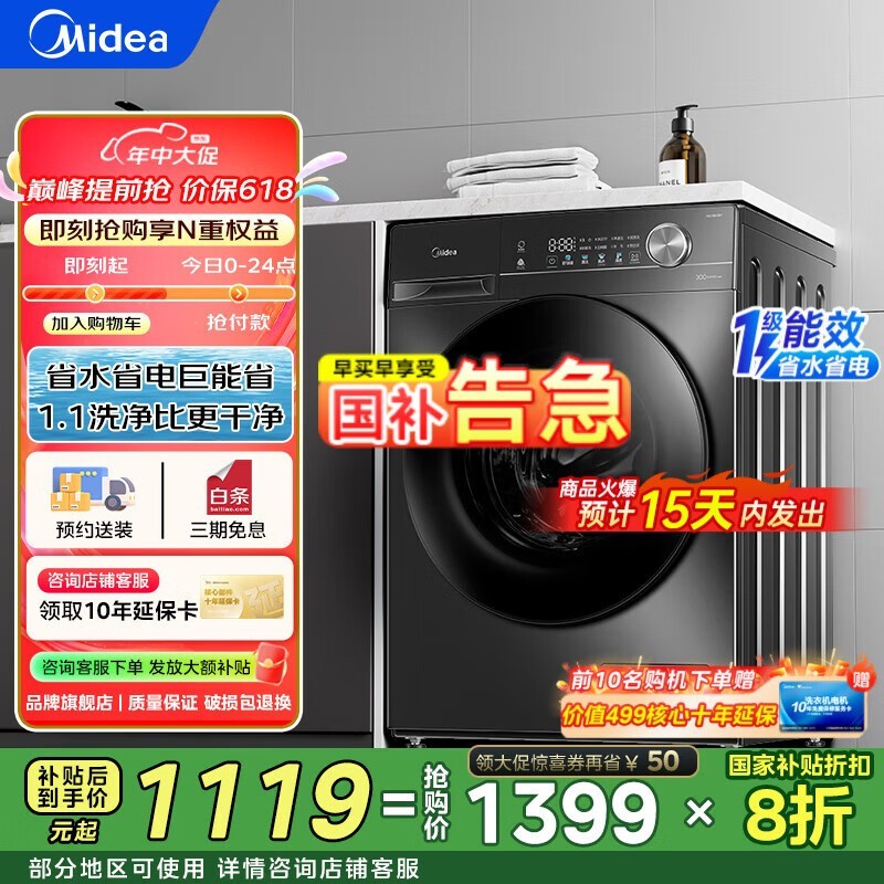 美的MG100V36T 10kg滚筒洗衣机仅需799元