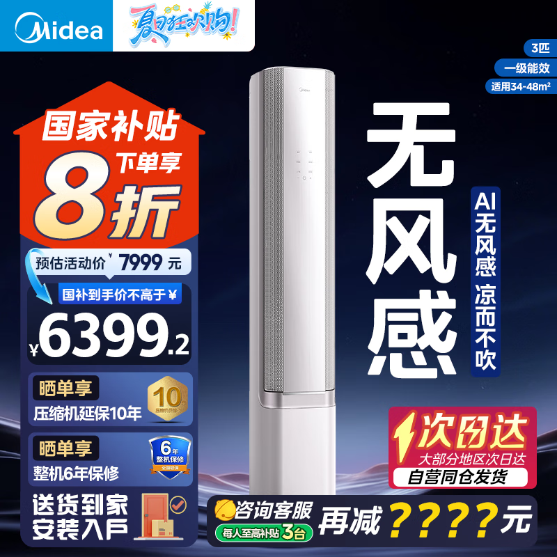 美的空调3匹无风感柜机大促!立省超2000元,实付5759元起
