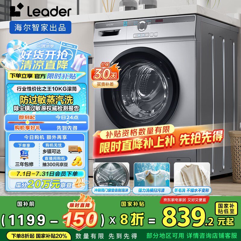 Leader滚筒洗衣机TQG100 - B29S京东促销价827元