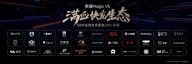 在显示方面,荣耀Magic V5满血高亮双屏,5000尼特峰值亮度,超高频调光,更清晰,更护眼;在快充生态方面,荣耀Magic V5支持66W有线快充,并支持覆盖市面上最广的230多款主流车型的50W无线快充,续航无忧。