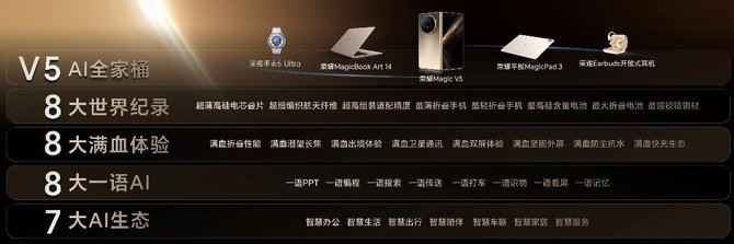 自发布第 一代折叠屏产品以来,荣耀始终引领折叠屏领域进化迭代方向,持续挑战折叠屏产品极限。荣耀Magic V5厚度为8.8mm全球最薄、217g全球最轻,再次刷新行业轻薄纪录。