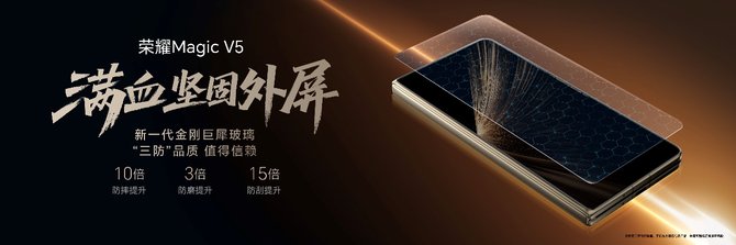 在可靠性方面,荣耀Magic V5搭载新一代金刚巨犀玻璃,防摔、防磨、防刮;满血防尘抗水,全系支持IP58和IP59。