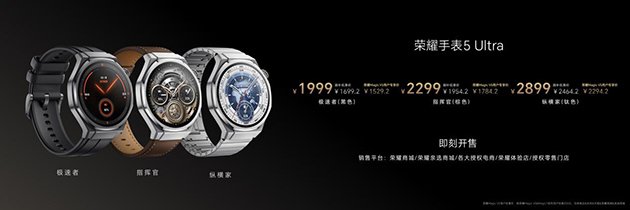 荣耀手表5 Ultra在荣耀商城、荣耀亲选商城、各大授权电商平台、荣耀体验店、荣耀授权门店正式开售,首销国补到手价1699.2元起,购荣耀Magic V5 & Magic7系列用户优惠200元(仅体验店&京东&天猫&荣耀商城&亲选商城)。