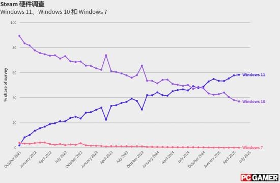 PCgamer根据Valve在互联网档案馆的Wayback Machine网站上发布的每月Steam硬件调查报告,制作了Windows 11、10和7在每次调查中所占的百分比图标。