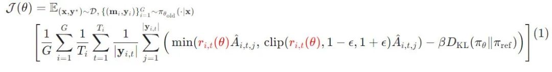 (2)其次是针对多轮交互场景的强化学习,不同于本研究将每一轮的完整输出定义为一个动作,通过引入轮次级比率(turn-level ratio)来进行 loss 归一化与剪切, 具体优化目标如下所示: