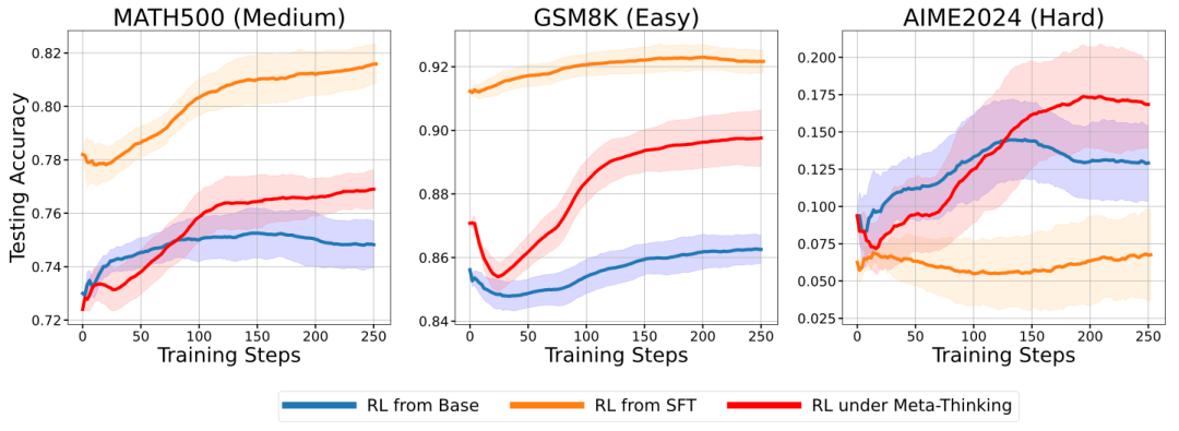 图三展示了训练过程中三种不同难度的测试集上的准确率变化趋势,实验结果证明了元思维对于推理模型的强化学习具有促进作用,尤其是在更困难的任务上具有更好的泛化性。