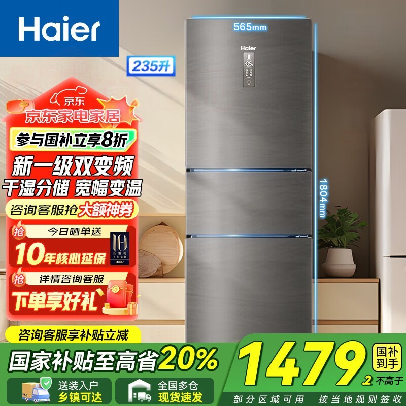 海尔235L三门冰箱 京东优惠低至1399元