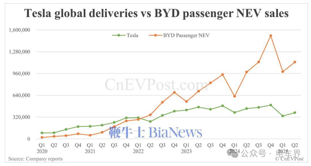 特斯拉季度交付量持续下滑,进一步拉大了其与比亚迪之间的差距。