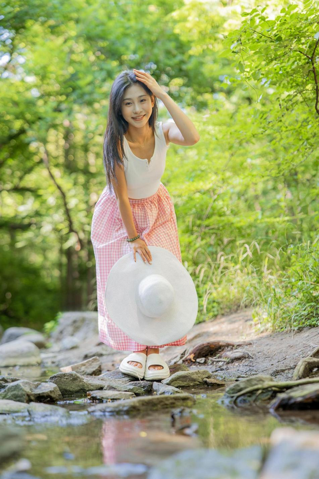 佳能EOS R100拍摄,1/100s、F1.8、ISO100、0EV而在拍摄的间隙,我发现模特手中的大草帽和红白格纹裙简直就是绝配,于是我让模特拿着帽子背对我,站在绿意盎然的小溪流中。利用浅景深虚化背景,让繁杂环境简化,突出了模特主体,营造出静谧又惬意的氛围,很贴合夏日想捕捉的轻松感。整个照片非常有故事感。
